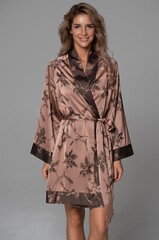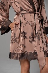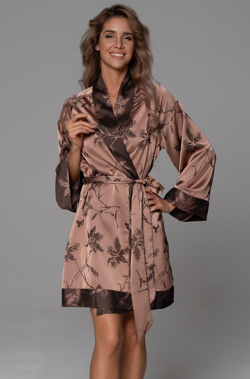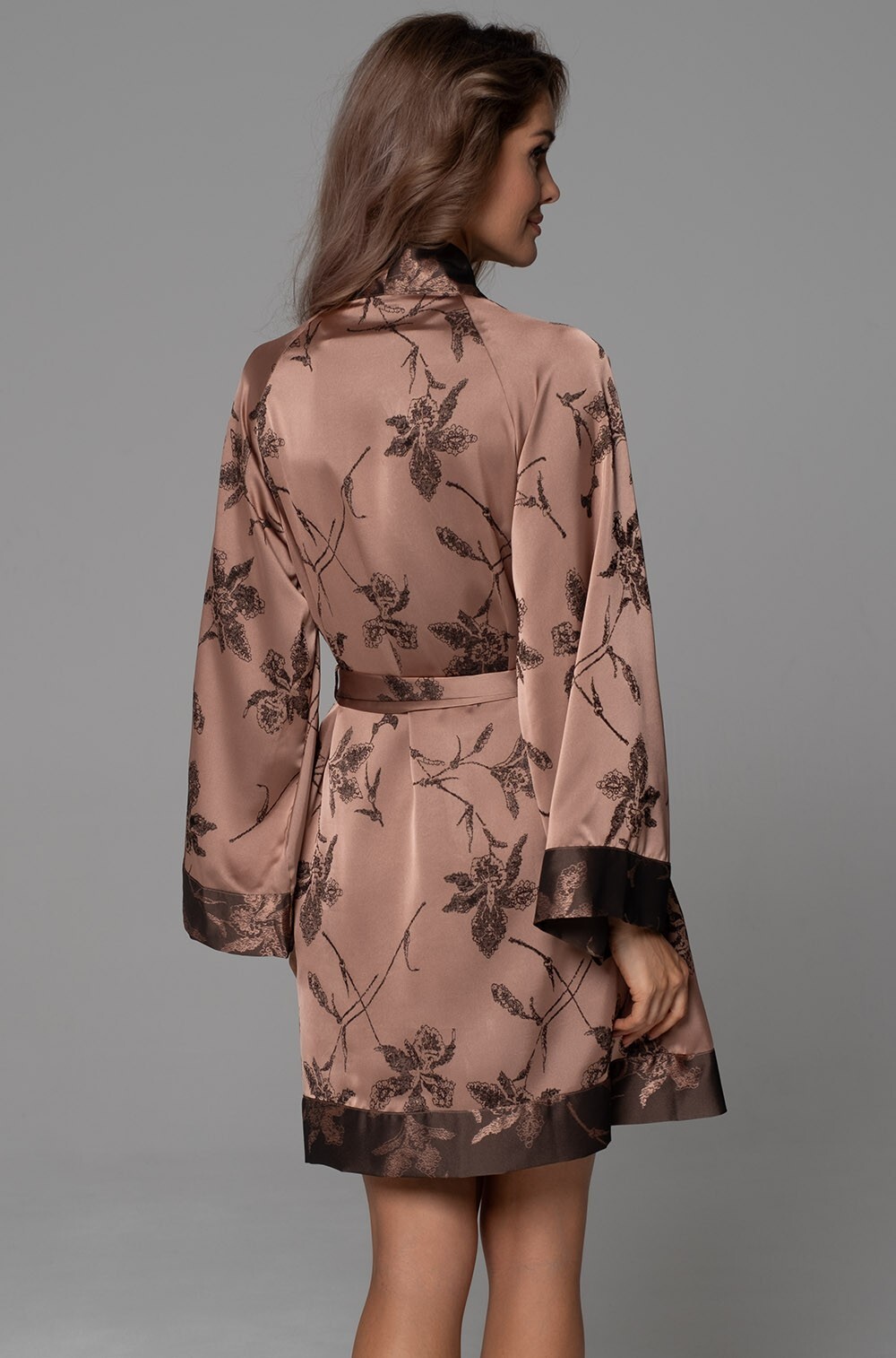 Короткий запашной халат Mia-Amore с длинными рукавами выполнен из жаккардового двухцветного смесового шёлка. Манжеты и планки халатов выполнены из отделочной тёмной стороны шёлка. Халат комплектуется широким поясом.