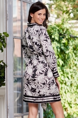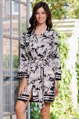 Короткий халат Mia-Amore с застежкой на пуговицы с длинными рукавами выполнен из принтованного атласа в черно-белой гамме, по низу халата и рукавов купонный рисунок в виде черно-белых полос. Состав: полиэстер 100%