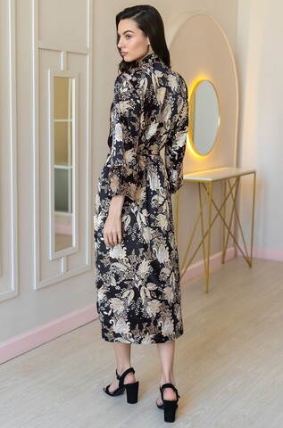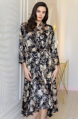 Длинный запашной халат Mia-Amore выполнен из принтованного смесового шёлка. Низ рукавов, ланка халата отделана золотым кантом. Халат запахивается на пояс с золотыми декоративными кисточками, в боковых швах есть карманы.