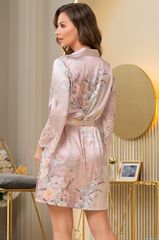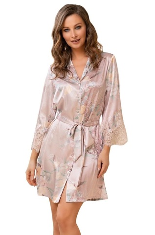 Короткий халат Mia-Amore на пуговицах с рукавом длиной 7/8, выполнен из принтованного смесового шелка и декорирован ажурным кружевом, которое расположено по низу рукавов. Линия борта подчеркнута контрастным кантом. В боковых швах обработаны карманы. Халат дополнен поясом.