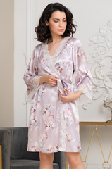Короткий запашной халат Mia-Amore с широким длинным рукавом, выполнен из принтованного смесового шелка и декорирован ажурным кружевом, которое расположено по низу рукавов и вдоль бортов полочек. По бокам обработаны карманы.