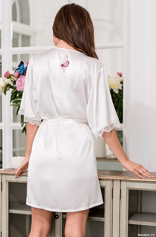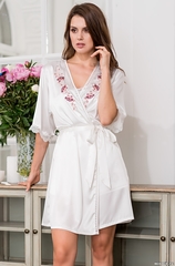 Короткий запашной халат Mia-Amore с рукавом ¾, украшенный традиционной для Европы цветочной вышивкой. Рукав декорирован ажурным кружевом, воротник — мережкой. Состав 70% натуральный шелк, 25% полиэстер, 5% эластан