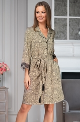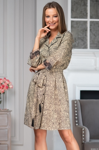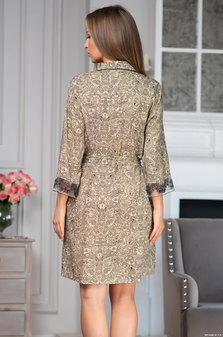 Короткий халат Mia-Amore на пуговицах с рукавами ¾ выполнен из принтованной тканой вискозы. Воротник и борта халата, а так же отделка накладного нагрудного кармана, декорированы тонким черным кантом, в цвет рисунка. Низ рукавов изящно декорирован роскошной вышивкой на тюле. В боковых швах карманы. В комплекте к халату идет пояс с кисточками.