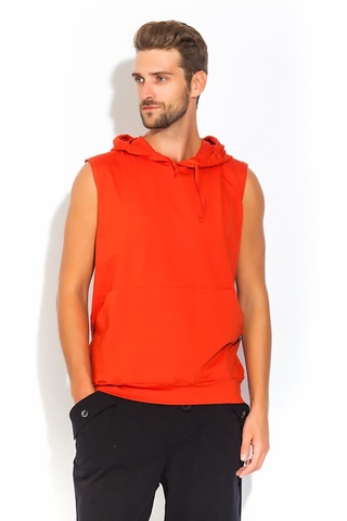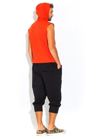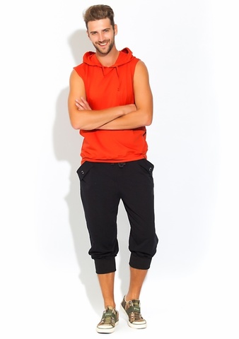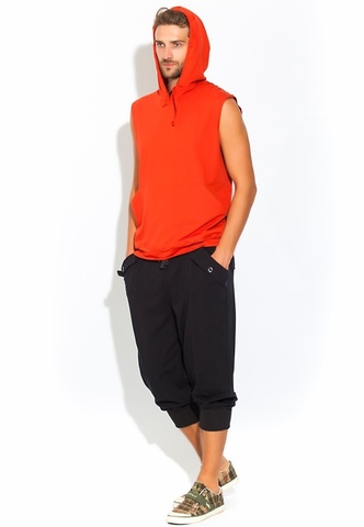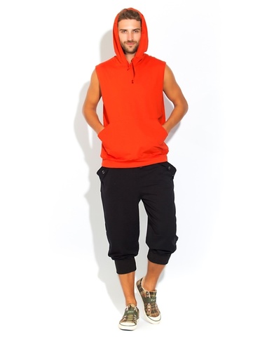 Комплект состоит из футболки и удлиненных шорт-бридж. Футболка в модной тенденции этого сезона: без рукавов, с полноценным капюшоном на завязках и внешними карманами на передней части в стиле "кенгуру". Она выполнена из хлопковой ткани средней плотности с добавлением лайкры(лайкра позволяет лучше держать форму изделия и не деформироваться, предотвращает выстирование цвета).