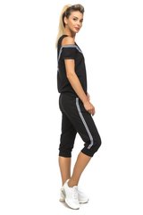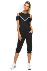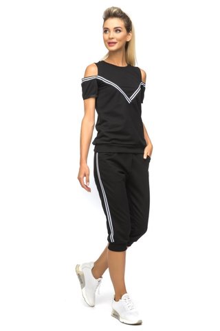 Бриджи оптимальной длины ниже колена с манжетам, украшены лампасом в мелкую полоску в цвет отделки на футболке. Мягкий и широкий пояс на резинке. Удобные внутренние карманы.