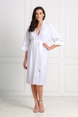 Женственный халат средней длины из мягкой велюровой ткани роскошного белого цвета. Мягкость велюра прекрасно сочетается с утонченным блеском атласной ткани, которой отделаны полочки и манжеты рукавов. Свободные рукава длиной 3/4 украшены нежной кружевной тканью и тонкой тесьмой вдоль манжет. Длинный, съемный пояс из белой атласной ткани подчеркивает силуэт. Эффектное сочетание ткани и кружева и длина подойдут женщинам, ценящим элегантность и комфорт. В этом прекрасном халате Вы будете выглядеть особенно элегантно. Характеристики: Длина рукава от плечевого шва или плеча (см): 54 Длина по спинке (см): 108 Степень плотности ткани: Средняя плотность Растяжимость ткани: Слабо тянется Состав: бамбук 60% , хлопок 25% , полиэстер 15%