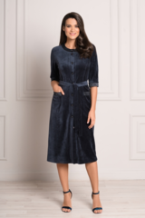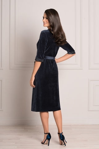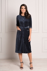 Мягкий халат из велюровой ткани насыщенного синего цвета. Накладные глубокие карманы, манжеты рукавов длиной в 3/4 и красивый вырез-лодочка декорированы атласной тканью в цвет халата. Модель застегивается на красивые пуговицы, украшенные стразами. Удобные карманы добавляют модели комфорта. Длинный, съемный пояс, так же продублированный атласной тканью, подчеркивает силуэт. Классический крой и длина чуть ниже колена подойдут женщинам, ценящим элегантность и комфорт. В этом прекрасном халате Вы будете выглядеть особенно женственно. Характеристики: Длина рукава от плечевого шва или плеча (см): 40 Длина по спинке (см): 109 Степень плотности ткани: Средняя плотность Растяжимость ткани: Не тянется Состав: бамбук 60% , хлопок 25% , полиэстер 15%