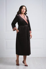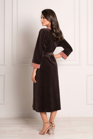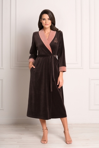 Элегантный длинный халат из мягкой велюровой ткани красивого коричневого цвета. Отложной воротник и манжеты халата выполнены из велюровой ткани подходящего коричнево-розового оттенка, прекрасно подчеркивающего основной цвет модели. Модель декорирована на левой груди красивым рисунком из страз. Удобные, глубокие боковые карманы добавляют модели комфорта. Длинный, съемный пояс подчеркивает силуэт. Классический крой и длина подойдут женщинам, ценящим элегантность и комфорт. В этом прекрасном халате Вы будете выглядеть особенно женственно. Рекомендована деликатная стирка.