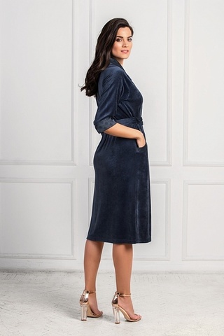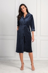 Элегантный домашний халат выполнен из мягкой велюровой ткани с добавлением бамбука, который делает ткань особенно мягкой, а также гипоаллергенной и устойчивой к стирке. Модель декорирована вставками из атласной принтованной ткани в тон основной на отложном воротнике, манжетах рукавов длиной 3/4, карманах и поясе. Плавные линии отложного воротника и втачных полукруглых карманов подчеркивают женственный силуэт. Удобный пояс на шлевках. Халат застегивается спереди на красивые пуговицы, украшенные стразами.