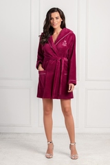 Уютный короткий халатик красивого ягодного цвета выполнен из мягкой велюровой ткани с натуральными волокнами бамбука. Отложной воротник, переходящий в глубокий капюшон, и манжеты халата отделаны тонким атласным кантом, прекрасно подчеркивающим основной цвет ткани. Удобные, глубокие накладные карманы добавляют модели комфорта. Длинный, съемный пояс на шлевках подчеркивает силуэт. Классический крой и длина подойдут женщинам, ценящим удобство и комфорт. В этом прекрасном халате безмятежный домашний отдых гарантирован.