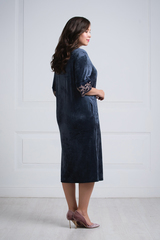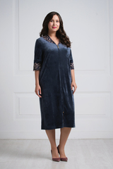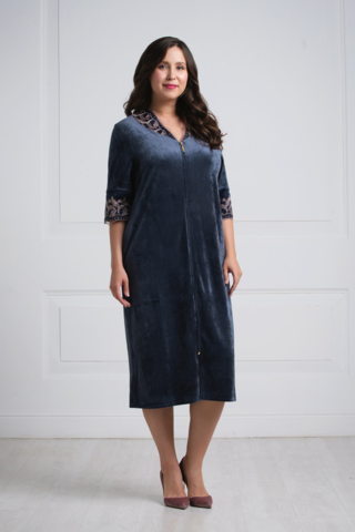 Женственный, мягкий халат средней длины ниже колена выполнен из нежной бархатистой ткани благородного темно-синего цвета с добавлением бамбука. Округлый воротничок халата и манжеты рукавов 3/4 выполнены из атласной ткани в тон и украшены изысканным кружевом с цветочной вышивкой. Модель застегивается на удобную застежку-молнию. Оптимальная длина и чуть приталенный крой подчеркнут достоинства и скроют недостатки фигуры. Сочетание изысканного цвета, ткани и кружева дарит элегантность, красивый декор подчеркнет красоту. Характеристики: Длина рукава от плечевого шва или плеча (см): 38 Длина по спинке (см): 116 Степень плотности ткани: Средняя плотность Растяжимость ткани: Не тянется