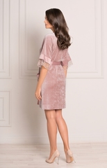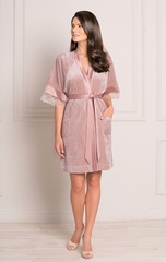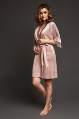 Женственная модель – халат удобной длины чуть выше колена на запахе из мягкой велюровой ткани с натуральным бамбуком нежного цвета пудры. Комфортная длина модели и свободный силуэт созданы для отдыха и красоты. Элегантный дизайн халата подчеркнут акцентами из атласной ткани и тончайшего кружева с цветочным узором, которым украшены широкие манжеты свободных рукавов длиной 3/4 и накладные карманы. Длинный съемный пояс отлично подчеркнет ваш стройный силуэт. Нежность ткани и кружева создают удивительную атмосферу и романтическое настроение.