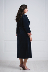 Элегантный длинный халат из мягкой велюровой ткани красивого синего цвета. Отложной воротник и манжеты халата выполнены из велюровой ткани подходящего приятного бежево-розового оттенка, прекрасно подчеркивающего основной цвет модели. Модель декорирована на левой груди красивым рисунком из страз. Удобные, глубокие боковые карманы добавляют модели комфорта. Длинный, съемный пояс подчеркивает силуэт. Классический крой и длина подойдут женщинам, ценящим элегантность и комфорт. В этом прекрасном халате Вы будете выглядеть особенно женственно. Рекомендована деликатная стирка.