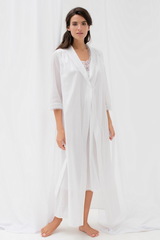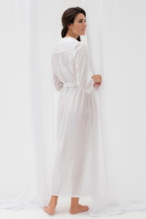 Женственный длинный халат классического силуэта на запахе выполнен из нежной 100% хлопчатобумажной ткани белого цвета. Отложной воротник, кокетка и манжеты рукавов продублированы тканью с цветочной вышивкой в виде розочек и окантованы ажурной тесьмой. Халат длины макси и свободного кроя для комфортной носки. В комплекте с халатом также длинный, съемный пояс на шлевках. Натуральная ткань и вышивка на ткани красиво подчеркивают нежность модели и ее обладательницы. Халат составит идеальный комплект с сорочкой из нашей коллекции. Характеристики: Длина рукава от плечевого шва или плеча (см) 50 Длина по спинке (см) 136 Тип воротника Отложной Степень плотности ткани Ткань легкая Растяжимость ткани Не тянется Особенность ткани Ткань просвечивается Пояс В комплекте Вырез горловины V-образный Тип рукавов В три четверти Состав: 100% хлопок
