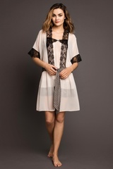 Воздушный, легкий халат свободного кроя из нежного, полупрозрачного шифона персикового цвета. Края полочек и широких, коротких рукавов декорированы вставками из роскошного мягкого кружева черного цвета с красивым узором, которое добавляет контраста модели и отлично сочетается с основной тканью. Халатик без застежки, на запАхе. Талию подчеркивает несъемный поясок, продублированный кружевом. Короткий, легкий халатик идеально подойдет для создания романтичного образа и составит отличный ансамбль с сорочками из этой коллекции. Характеристики: Длина по спинке (см): 92 Степень плотности ткани: Ткань тонкая Растяжимость ткани: Не тянется Состав: полиэстер 100%