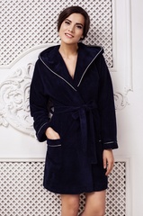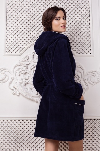 Уютный короткий халатик темно-синего цвета выполнен из мягкой велюровой ткани с натуральными волокнами бамбука. Отложной воротник, переходящий в глубокий капюшон, и манжеты халата отделаны тонким атласным кантом, прекрасно подчеркивающим основной цвет ткани. Удобные, глубокие накладные карманы добавляют модели комфорта. Длинный, съемный пояс на шлевках подчеркивает силуэт. Классический крой и длина подойдут женщинам, ценящим удобство и комфорт. В этом прекрасном халате безмятежный домашний отдых гарантирован. Характеристики: Длина рукава от плечевого шва или плеча (см): 61 Длина по спинке (см): 85 Тип воротника: Отложной Тип карманов: Накладные Степень плотности ткани: Высокая плотность Растяжимость ткани: Не тянется Особенность ткани: Мягкая и теплая Пояс: В комплекте Капюшон: Капюшон есть К-во карманов: 2 Состав: бамбук 60% , хлопок 25% , полиэстер 15%