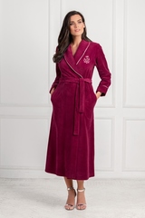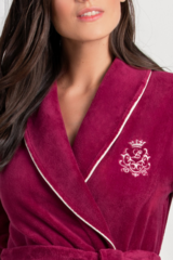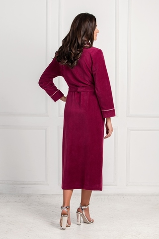Элегантный длинный халат яркого ягодного цвета выполнен из мягкой махровой ткани с натуральными волокнами бамбука. Отложной воротник и манжеты халата отделаны тонким атласным кантом, прекрасно подчеркивающим основной цвет ткани. Модель декорирована на левой груди красивой вышивкой - логотипом Laete. Удобные, глубокие боковые карманы добавляют модели комфорта. Длинный, съемный пояс на атласных шлевках подчеркивает силуэт. Классический крой и длина подойдут женщинам, ценящим элегантность и комфорт. В этом прекрасном халате Вы будете выглядеть особенно женственно. Характеристики: Длина рукава от плечевого шва или плеча (см): 56 Длина по спинке (см): 126 Тип воротника: Отложной Тип карманов: Втачные Степень плотности ткани: Высокая плотность Растяжимость ткани: Не тянется Особенность ткани: Мягкая и теплая Капюшон: Капюшона нет Вырез горловины: V-образный К-во карманов: 2 Состав: бамбук 60% , хлопок 25% , полиэстер 15%