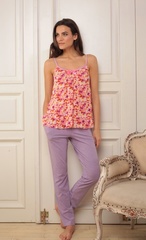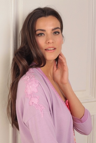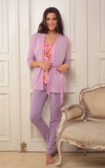 Очень красивый, нежный комплект для дома из 3-х предметов – жакета, топа и брючек. Легкий топ выполнен из вискозы с ярким принтом. Лиф топа с красивым V-образным вырезом украшен ажурной тесьмой, в области декольте застроченными рядами складочек и атласным бантиком с подвеской. Низ топа отделан очаровательной оборкой. Брючки прямого кроя с резинкой по талии и боковыми кармашками. Жакет свободного кроя со спущенной линией плеч и рукавами длиной 3/4 отделан вдоль полочек и рукавов атласным кантом в тон основной ткани. Изюминка жакета – красивые цветочными аппликации по верхней части рукавов и плеч. Жакет дополнен съемным поясом на шлевках.