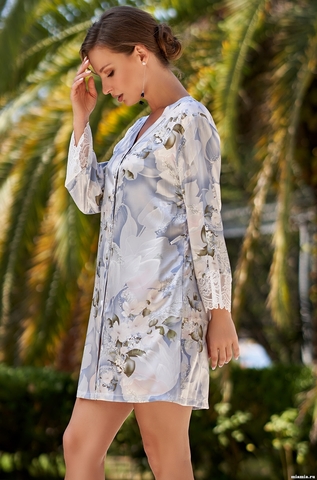 Короткая сорочка Mia-Amore на тонких бретелях из принтованного смесового шелкового полотна, верх декольте и низ сорочки декорирован кружевом. Сорочка украшена бантиком с подвеской. На спинке кружевная вставка. Состав 70% натуральный шелк, 25% полиэстер, 5% эластан