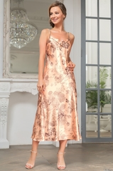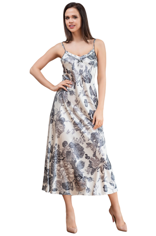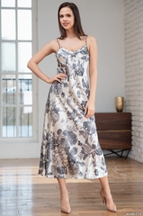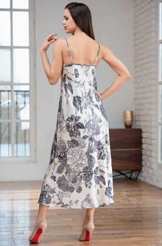 Длинная сорочка из смесового шелкового полотна молочного цвета с цветочным орнаментом. Сорочка приталенного силуэта, слегка расклешенная к низу. Тонкие бретели сорочки и отделка лифа декорированы кантом цвета графит, в тон принта.