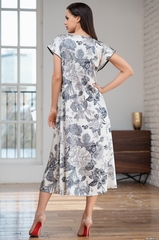 Элегантная длинная сорочка Mia-Amore из смесового шелкового полотна молочного цвета с цветочным орнаментом. Сорочка приталенная, слегка расклешенная к низу, отрезная под грудью. V-образная горловина украшена декоративным отложным воротничком и пуговицами. Короткие цельно выкроенные рукава сорочки и воротник оконтурены тонким кантом цвета графит, в тон принта.