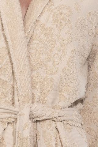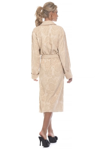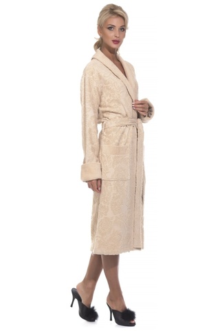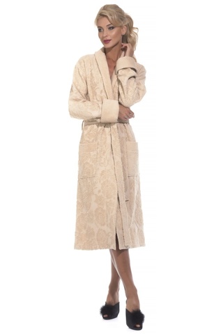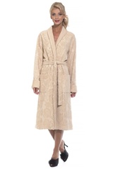 Изысканный и нежный халат из облегченной махровой ткани. 100% натуральный эко - хлопок. Оригинальный жаккардовый узор в виде крупных цветов по всему изделию - эффектно украшает халат и придает ему элегантный вид. Однотонная отделка воротника и манжета рукава в цвет изделия. Удобный полноценный рукав с манжетам. Удлиненная модель изделия(рост модели на фото 172 см.).