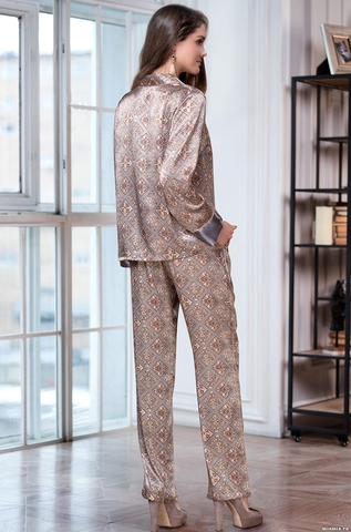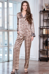 Комплект Mia-Amore состоит из жакета и брюк. Изделия комплекта выполнены из смесового щелка. Принтованный жакет с длинным рукавом и однотонной стальной отделкой по воротнику и манжетам, по центру обработана застежка на пуговицы. Брюки из принтованого атласа с карманами по бокам и небольшими разрезами по низу боковых швов. Состав: 70% натуральный шелк, 25% полиэстер, 5% эластан