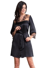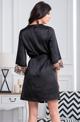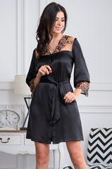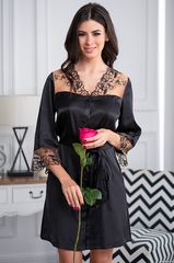 ЭКороткая рубашка Mia-Amore с центральной застежкой на пуговицы и V-образным вырезом, с рукавом ¾, выполнена из однотонного смесового шелка. Вырез горловины и манжеты рукавов декорированы вышивным кружевом. В боковых швах карманы. Рубашка дополнена поясом. Состав 70% натуральный шелк, 25% полиэстер, 5% эластан