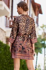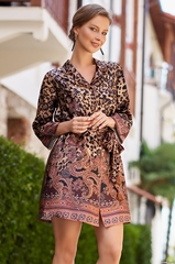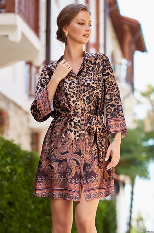 Короткая рубашка Mia-Amore с центральной застежкой на пуговицы, отложным воротником, рукавами ¾, выполнена из смесового шелкового полотна с анималистичным принтом. Линию борта украшает контрастный кант. К рубашке прилагается пояс с кисточками, в боковых швах есть карманы. Состав 70% натуральный шёлк, 25% полиэстер, 5% эластан