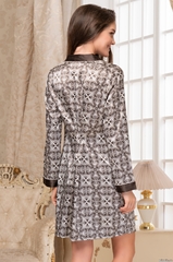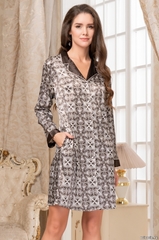 Удлинённая рубашка на пуговицах Mia-Amore выполнена из искусственного шелка с геометрическим рисунком. Основная часть рубашки выполнена из крупноузорчатого принта. В отделке воротника, низа рукавов используются атлас шоколадного цвета и белый тонкий кантик. Состав: полиэстер 100%