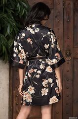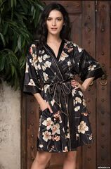 Короткий халат – кимоно Mia-Amore из смесового шелкового полотна с элегантным цветочным принтом. Борт халата, притачные широкие манжеты на рукавах ¾ и широкий пояс халата выполнены из черного смесового шелка с кантом золотистого оттенка в цвет принта.