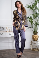 Элегантный комплект Mia-Amore из смесового шелкового полотна состоит из жакета и брюк. Жакет свободного силуэта, с отложным воротником, с длинными рукавами и прорезными карманами в рамку. К жакету прилагается двухсторонний пояс. Жакет выполнен из основного полотна, с роскошным восточным узором, в качестве отделки – ткань-компаньон и золотистый кантик, в цвет рисунка. Брюки выполнены полностью из ткани-компаньона, в боковых швах карманы. Состав 70% натуральный шелк, 25% полиэстер, 5% эластан
