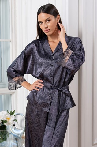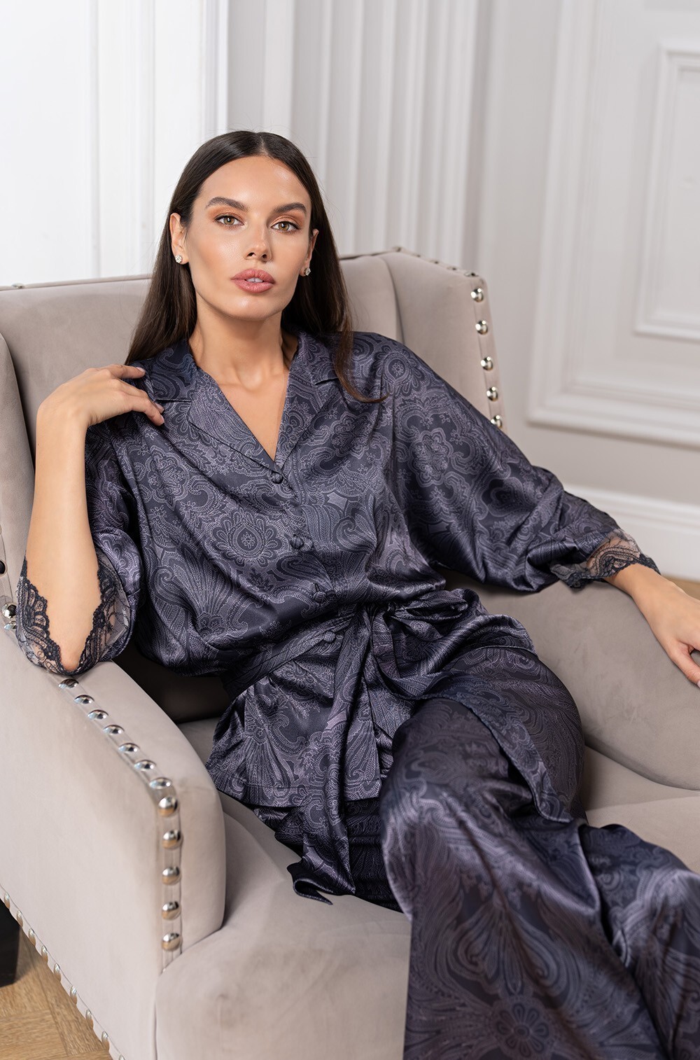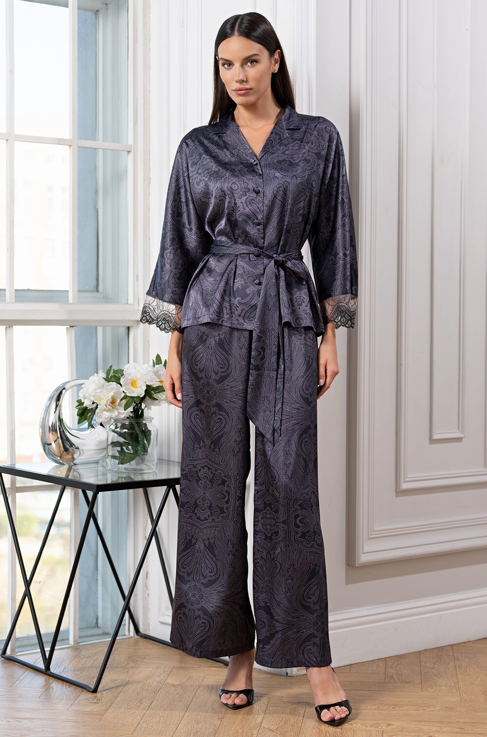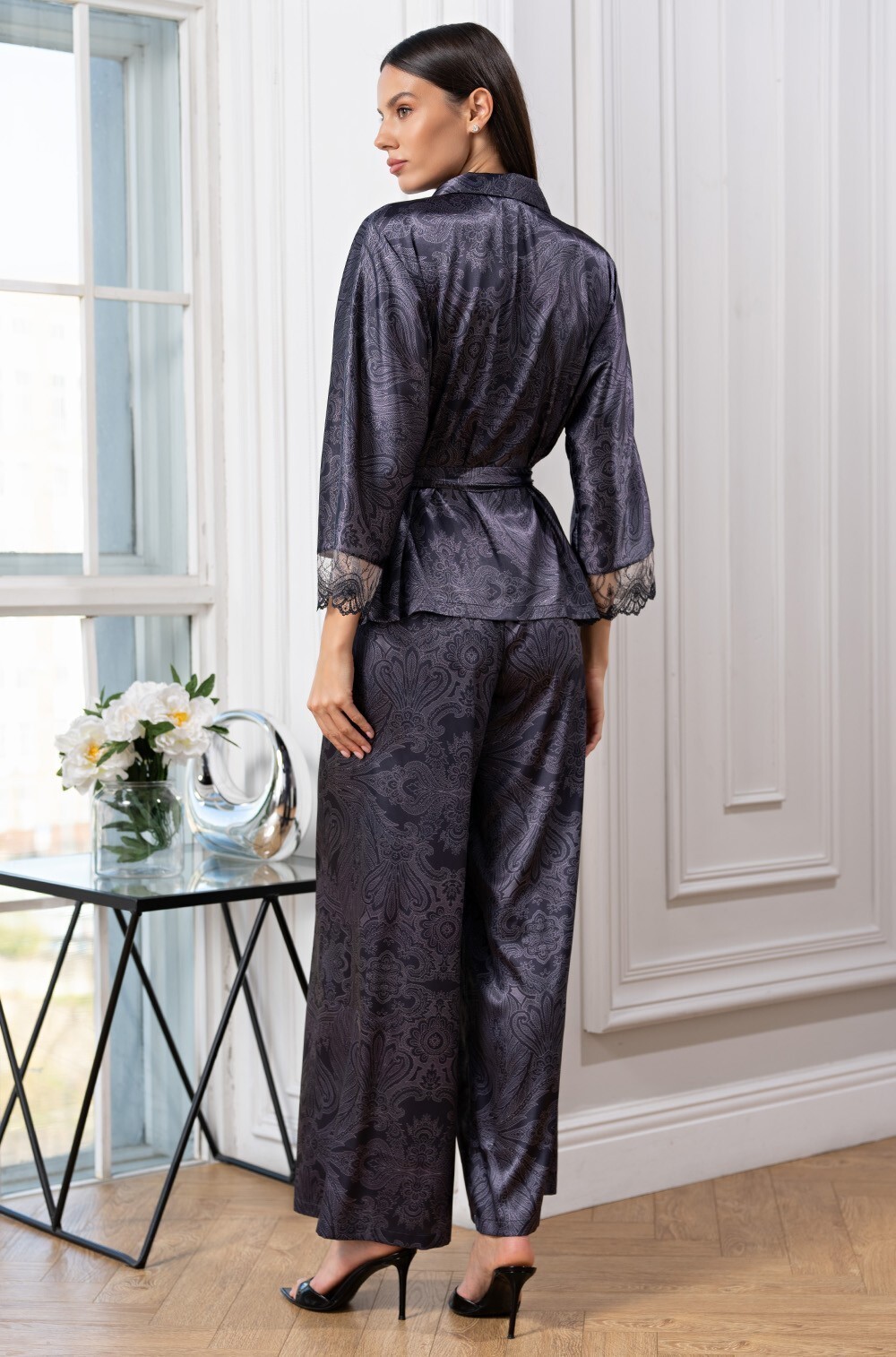 Комплект Mia-Amore состоит жакета и широких брюк. Изделия комплекта выполнены из принтованного смесового шелка. Линию талии можно подчеркнуть за счет широкого пояса, который идет в комплекте.