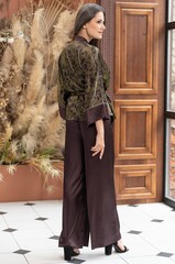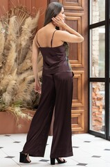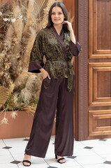 Комплект-тройка Mia-Amore состоит из топа на тонких бретелях, запашного жакета и широких брюк. Комплект выполнен из комбинации принтованного и однотонного смесового шелка и дополнен контрастным кантом. По бокам брюк обработаны карманы. Линию талии можно подчеркнуть за счет пояса, который идет в комплекте.