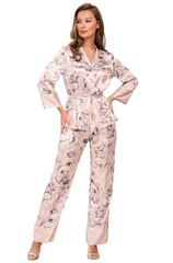 Комплект Mia-Amore, рубашка с брюками, выполнен из смесового шелка пастельной гаммы. Рубашка выполнена из цветочного принта с мелкоузорчатой отделкой по воротнику и низу рукавов, брюки - из мелкоузорчатого принта.