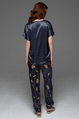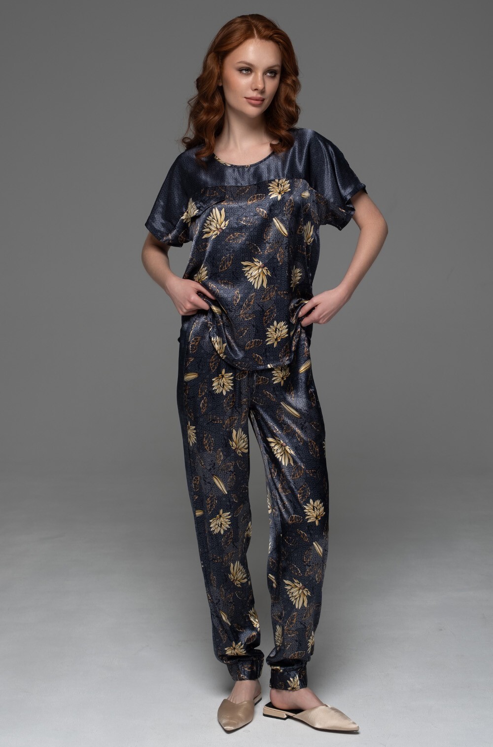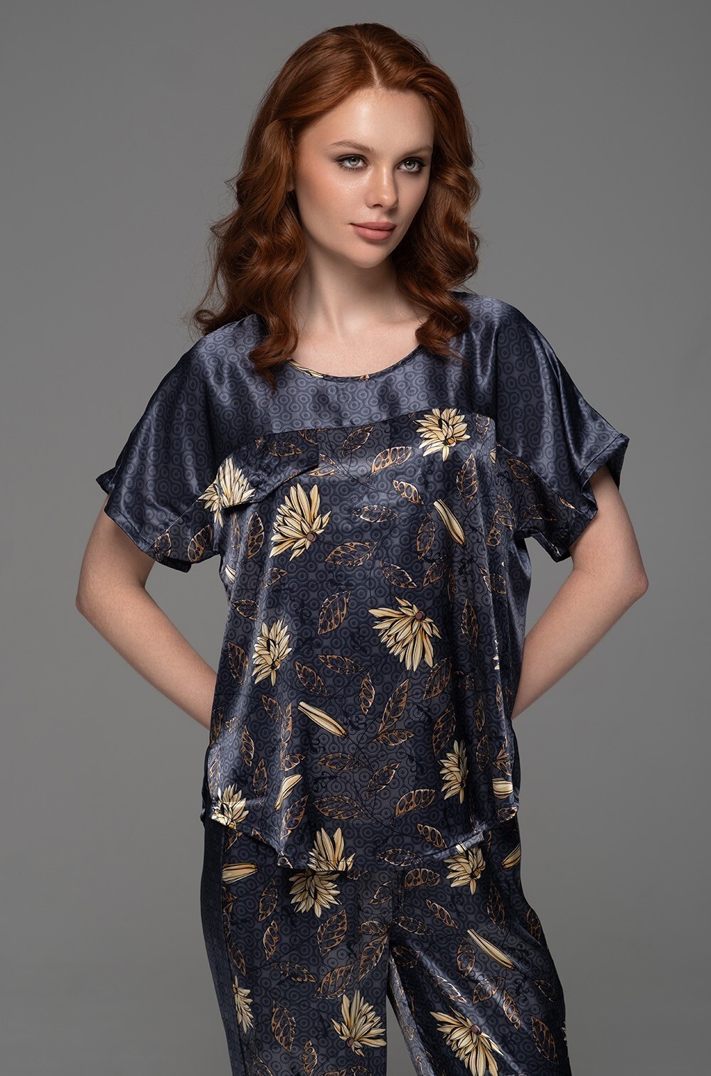 Комплект топ с брюками Mia-Amore выполнен из принтованного смесового шёлка. Топ со спущенными плечами, на полочке декоративный клапан с пуговкой. По низу штанины брюки собраны на манжет.