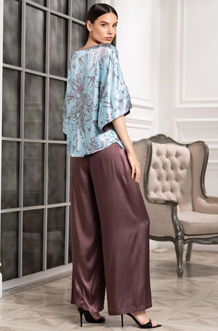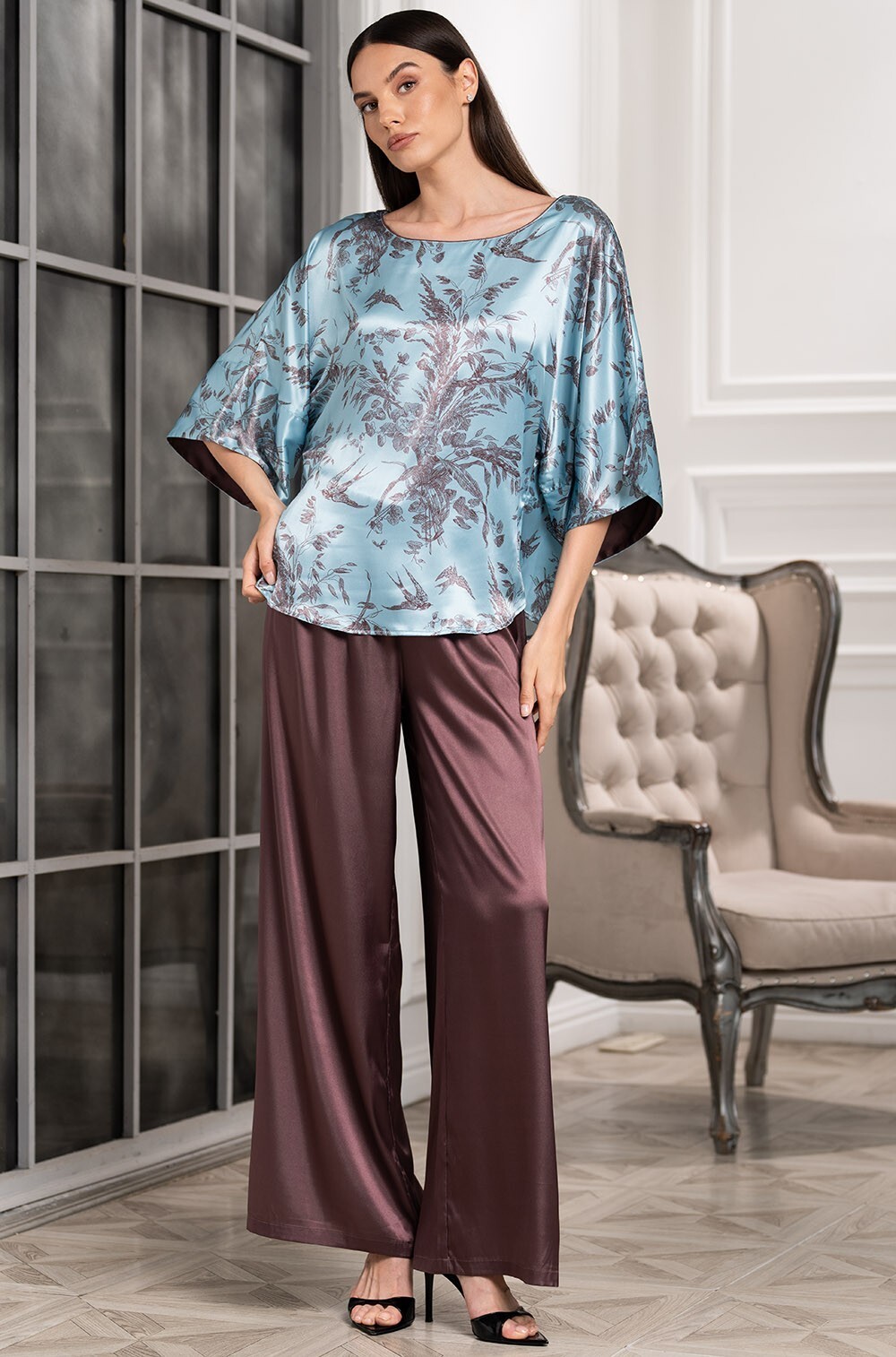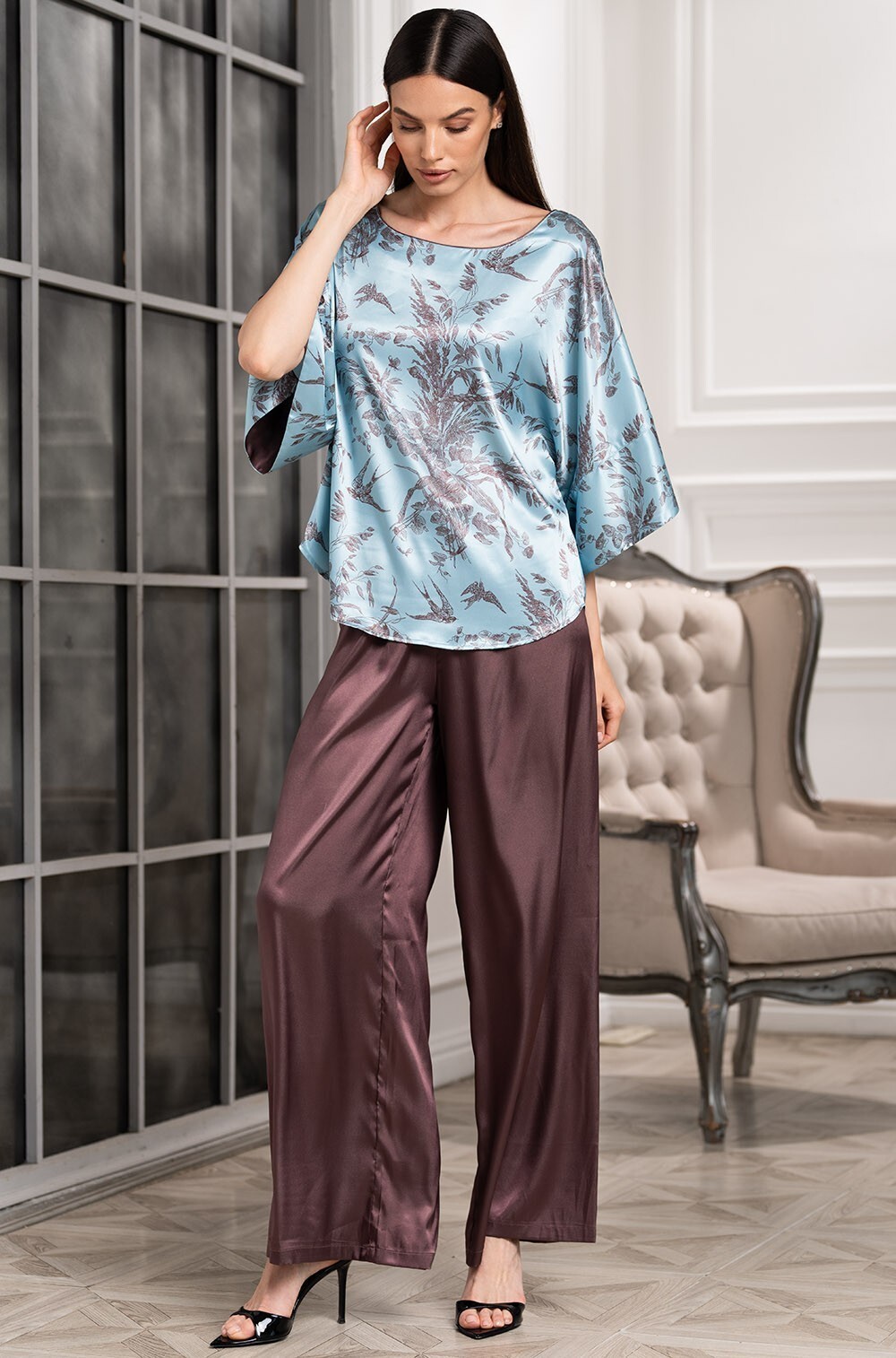 Комплект Mia-Amore состоит принтованного топа свободного силуэта и однотонных широких брюк-палаццо. Комплект выполнен из смесового шелка.
