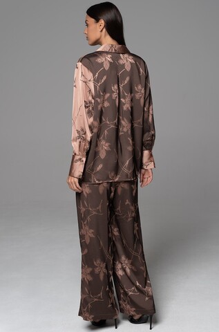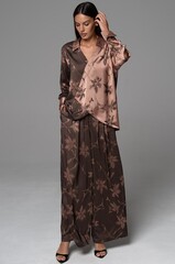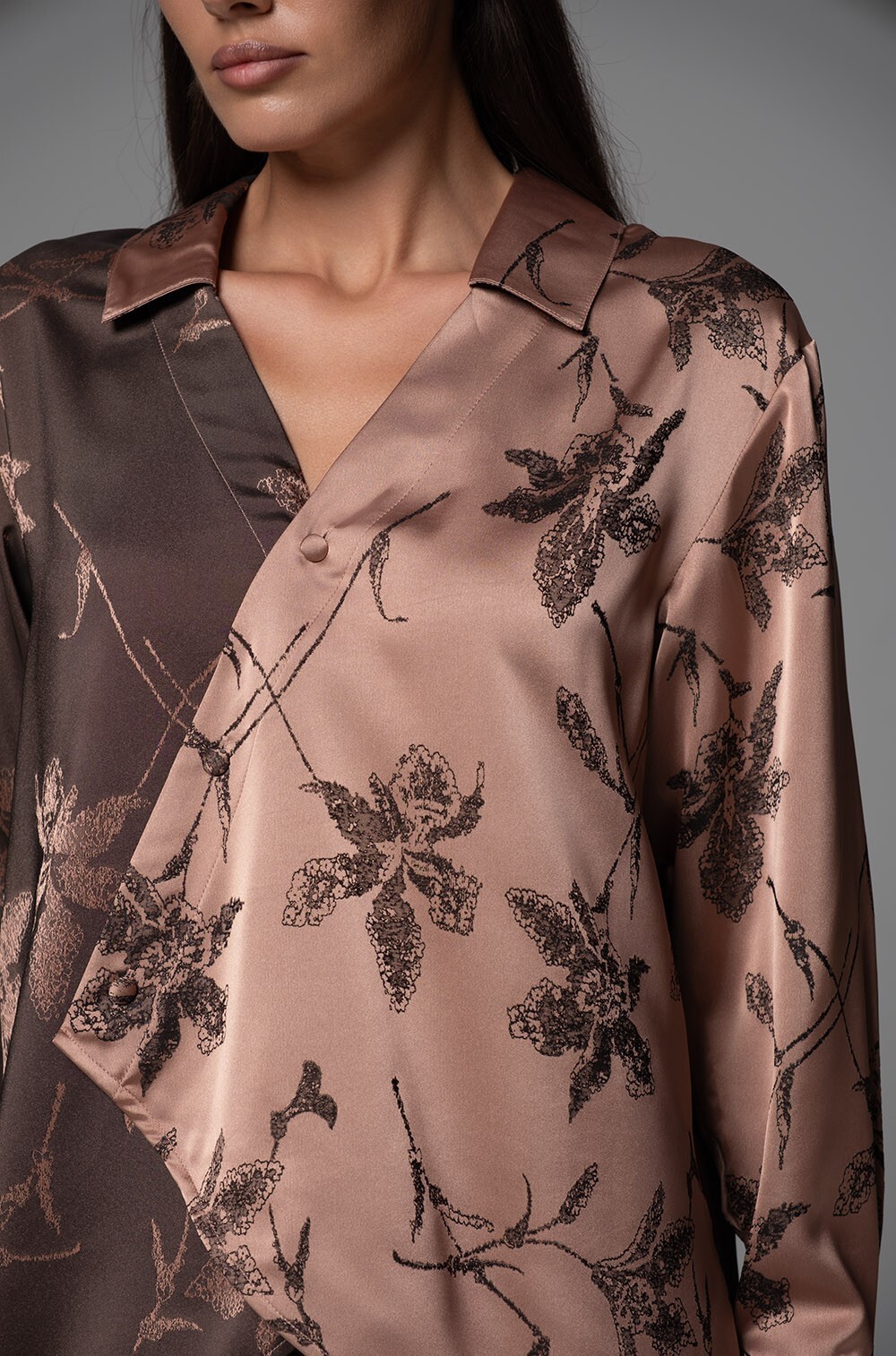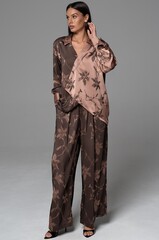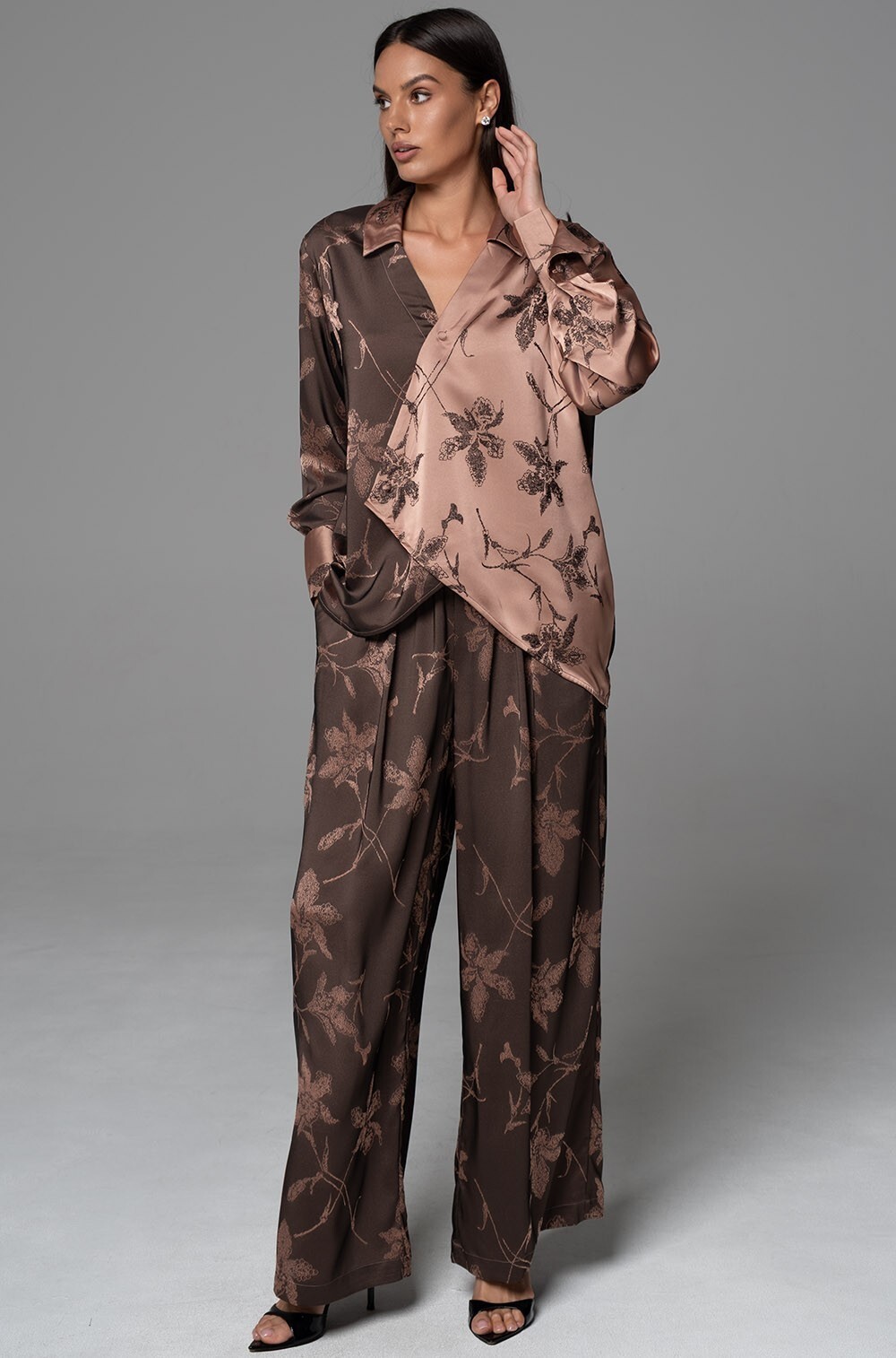 Комплект Mia-Amore состоит из блузы свободного силуэта с длинными рукавами и ассиметричной декоративной застёжкой на пуговицы и широких брюк. Комплект выполнен из жаккардового двухцветного смесового шёлка. Блуза выполнена в цветовом сочетании тёмного и светлого жаккарда. Брюки тёмного оттенка с эластичным поясом и с боковыми карманами.