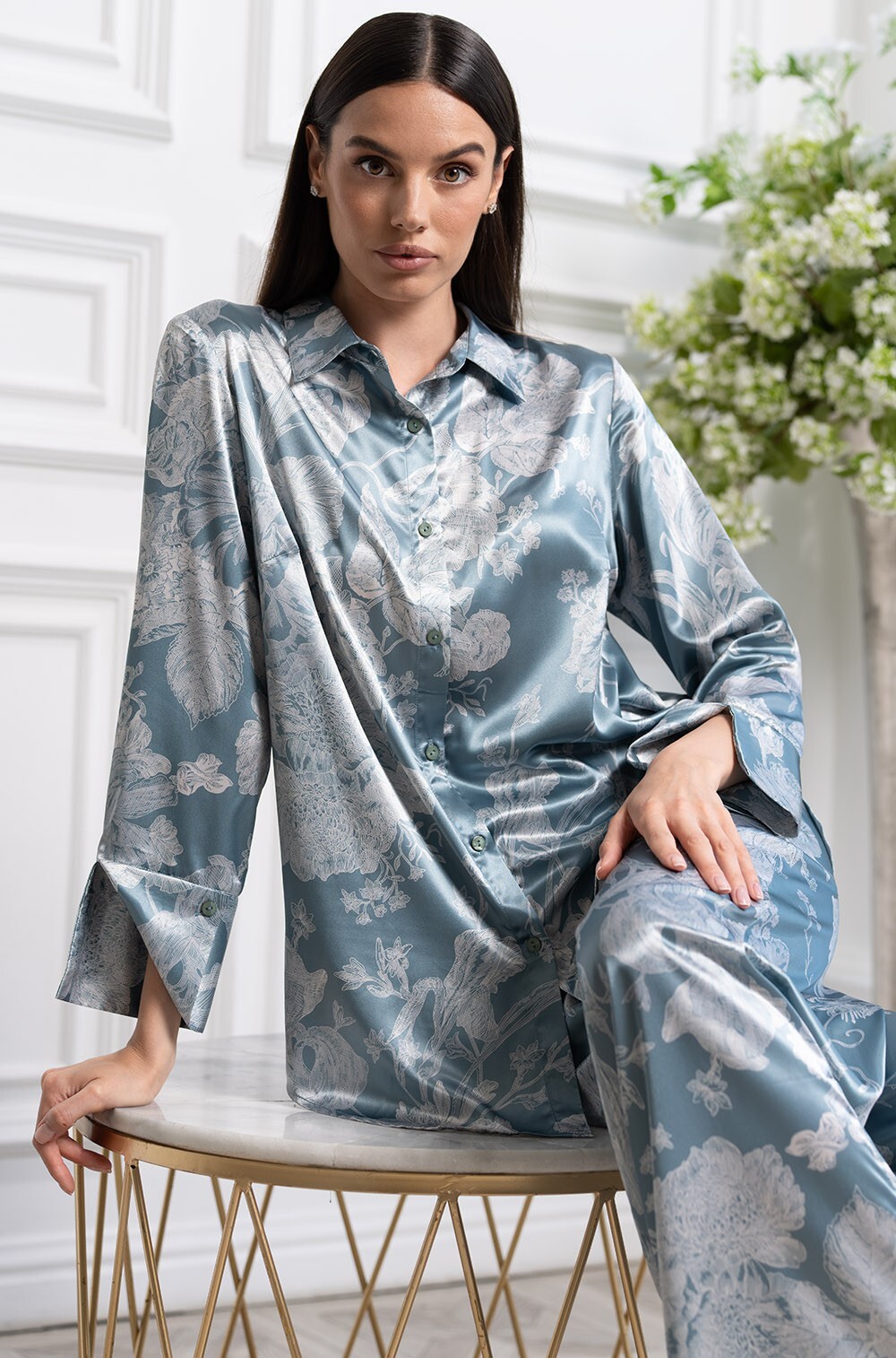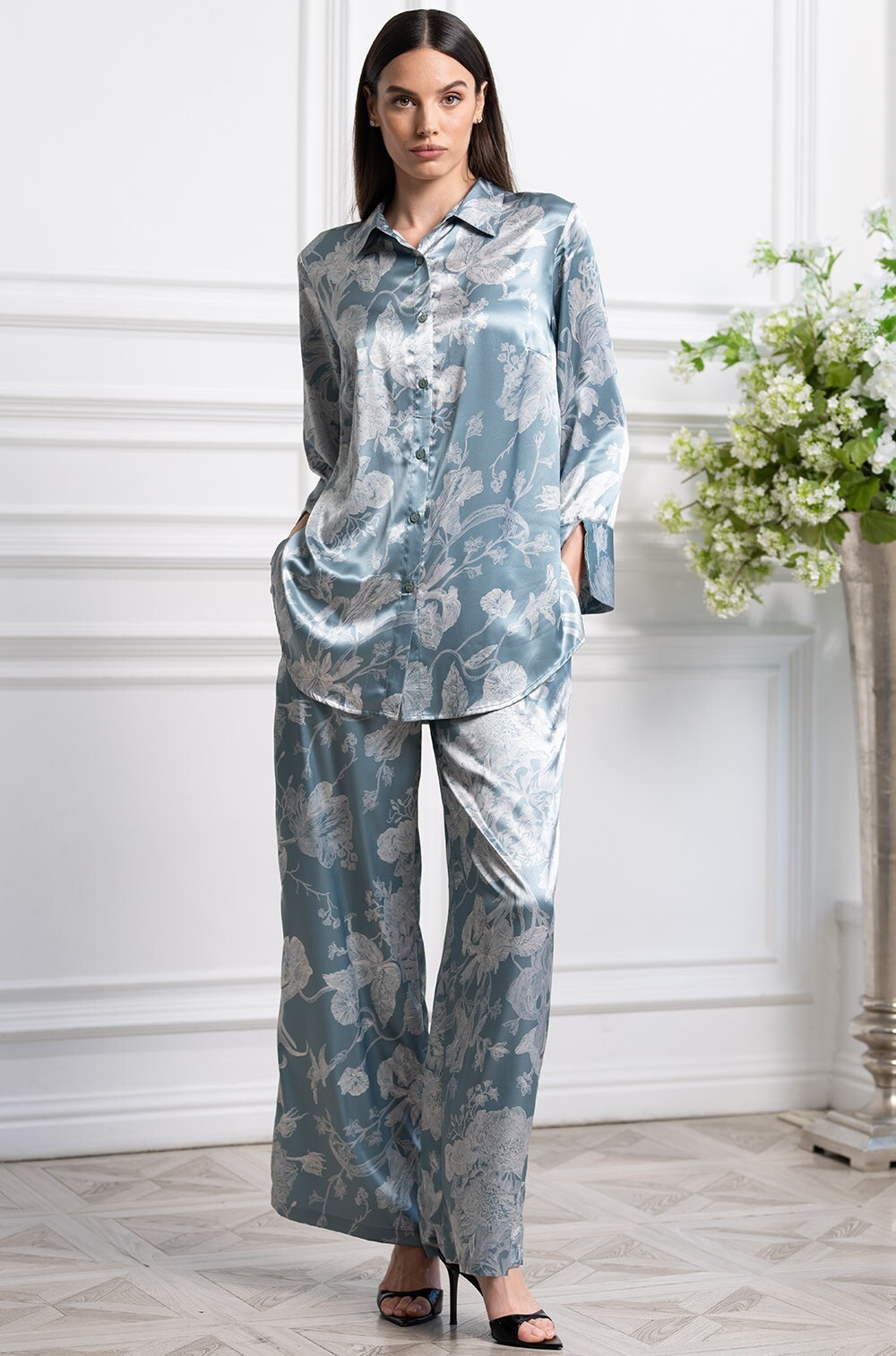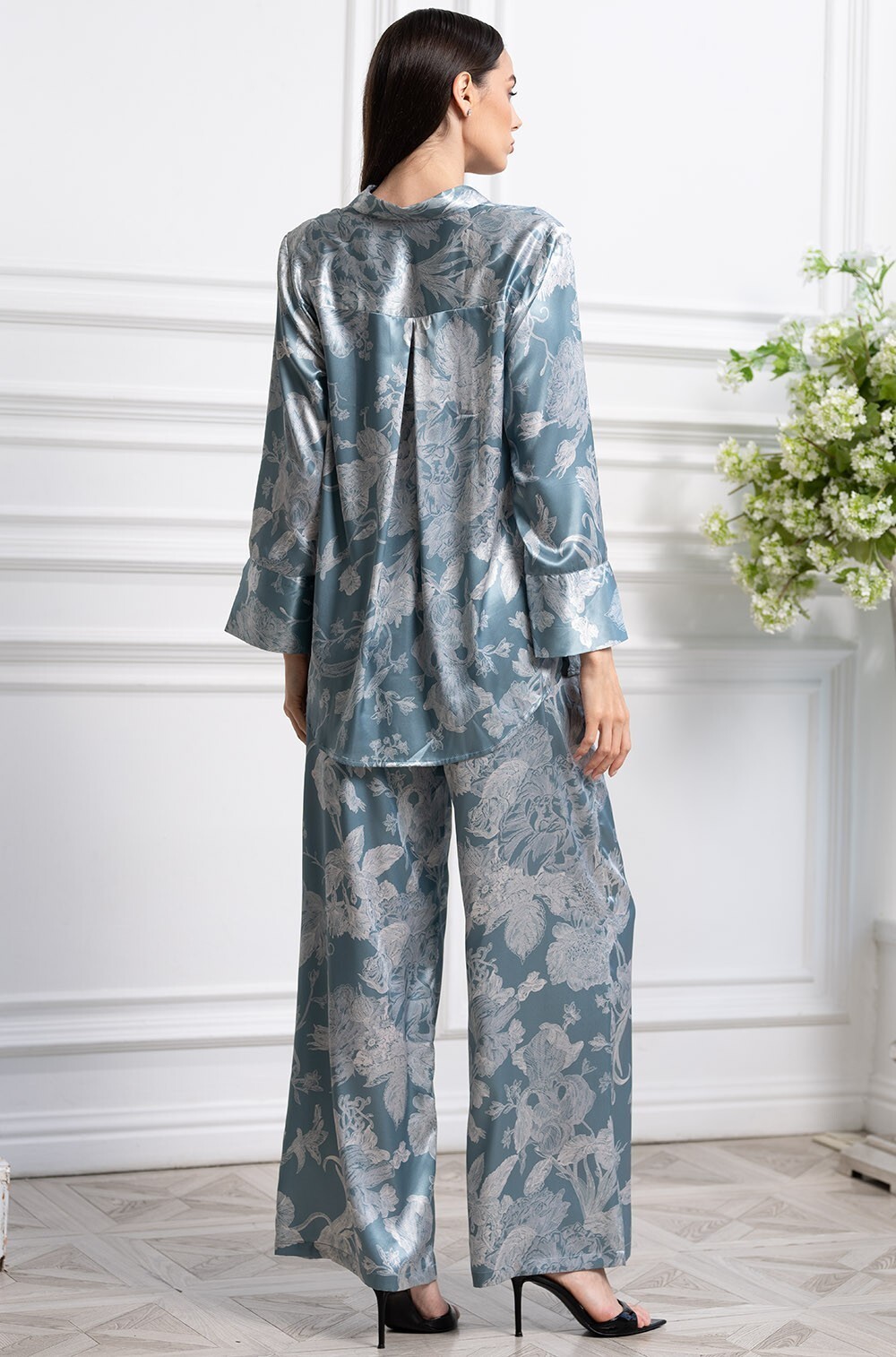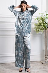 Комплект Mia-Amore выполнен из принтованного смесового шёлка и состоит из рубашки на пуговицах и широких брюк-палаццо.