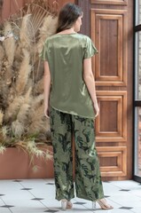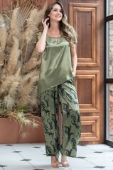 Комплект Mia-Amore состоит из топа с коротким рукавом, ассиметричной линией низа и широких брюк. Топ выполнен из однотонного смесового шелка, а брюки из принтованного.