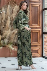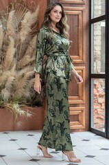 Комплект Mia-Amore состоит из жакета свободного силуэта с длинным рукавом и широких брюк. Комплект выполнен из принтованного смесового шелка с однотонной отделкой. По бокам модели обработаны карманы. Линию талии можно подчеркнуть за счет пояса, который идет в комплекте.