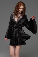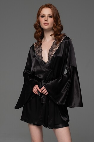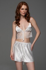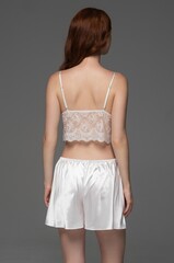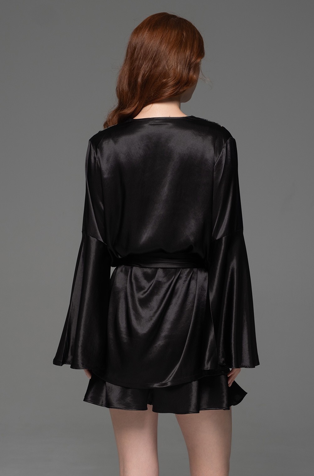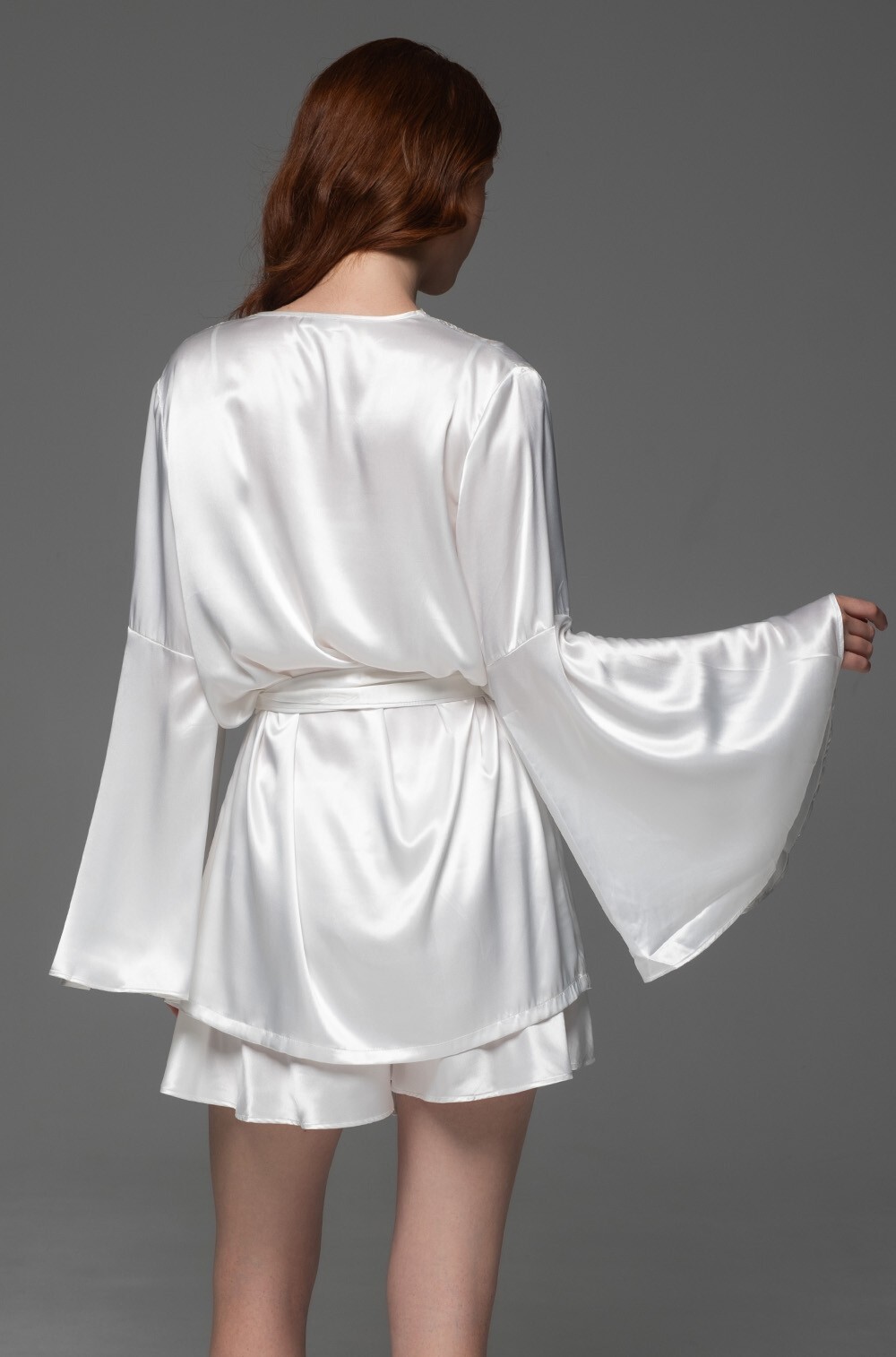 Комплект-тройка Mia-Amore выполнен из однотонного смесового шёлка, состоит из запашного короткого халатика, кроп-топа и шорт. Кроп-топ по низу декорирован кружевом, спереди завязки, шорты слегка расклешены по низу, рукава халата тоже расширяются по низу, вырез горловины халата украшен кружевом. Халат запахивается с помощью широкого съемного пояса.
