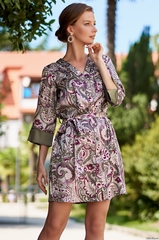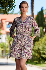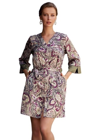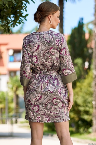 Короткая рубашка Mia-Amore с центральной застежкой на пуговицы и V-образным вырезом, с рукавом ¾, выполнена из принтованного смесового шелка. Манжеты рукавов выполнены из однотонного полотна. Линию борта, манжет и верх накладного кармана украшают тонкие контрастные канты. По бокам карманы. Состав 70% натуральный шёлк, 25% полиэстер, 5% эластан