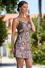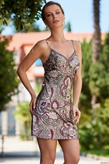 Короткая сорочка Mia-Amore на тонких бретелях с отрезными чашками из принтованного смесового шелкового полотна. Лиф сорочки декорирован однотонной обтачкой с контрастным кантом и вырезом-капелька. Сорочка украшена бантиком с подвеской. Состав 70% натуральный шёлк, 25% полиэстер, 5% эластан