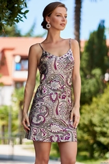 Короткая сорочка Mia-Amore на тонких бретелях без подреза из принтованного смесового шелкового полотна. Лиф сорочки декорирован обтачкой контрастного цвета.