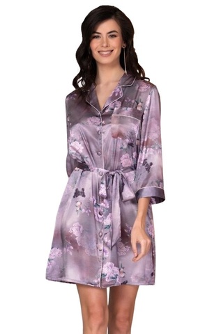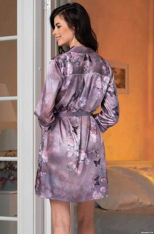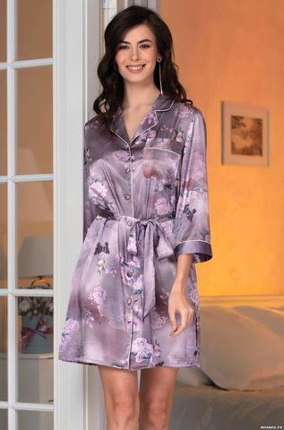 Рубашка Mia-Amore с центральной застежкой на пуговицы выполнен из смесового принтованного шелка. Рукава, воротник, борт халата и карман отделаны тонким розовым кантом. Ширина халата регулируется по талии поясом, в боковых швах карманы.