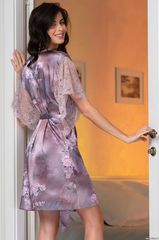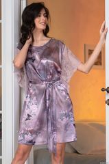 Свободная туника Mia-Amore длиной до колен выполнен из смесового принтованного шелка. Спущенные свободные рукава выполнены из кружева. Ширина туники регулируется по талии поясом, в боковых швах карманы. Состав 70% натуральный шелк, 25% полиэстер, 5% эластан