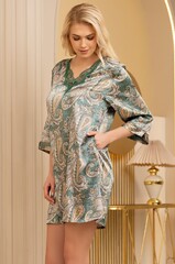 Туника Mia-Amore свободного покроя с рукавом длиной ¾, выполнена из принтованной смесовой ткани. Верх туники украшен кружевной вставкой. В боковых швах расположены карманы, а понизу разрезы.