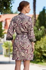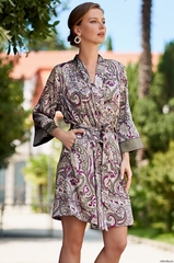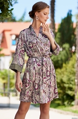 Короткий халат Mia-Amore выполнен из принтованного смесового шелкового полотна. Манжеты выполнены из однотонного полотна. Линию борта и манжеты рукавов украшают тонкие контрастные канты. В боковых швах карманы. Состав 70% натуральный шёлк, 25% полиэстер, 5% эластан