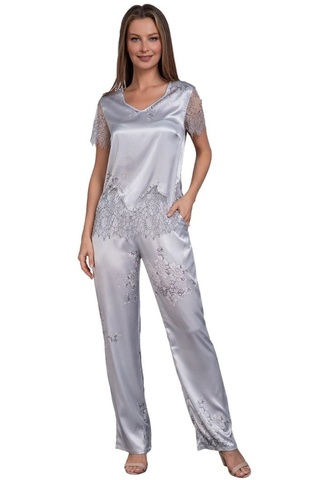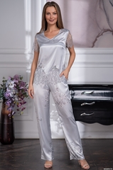 Комплект с брюками Mia-Amore выполнен из принтованного серебристого смесового полотна. Низ блузки декорирован изысканным широким кружевом, короткие рукава выполнены из кружева. По центру лифа милый бантик с подвеской. Состав 70% натуральный шелк, 25% полиэстер, 5% эластан